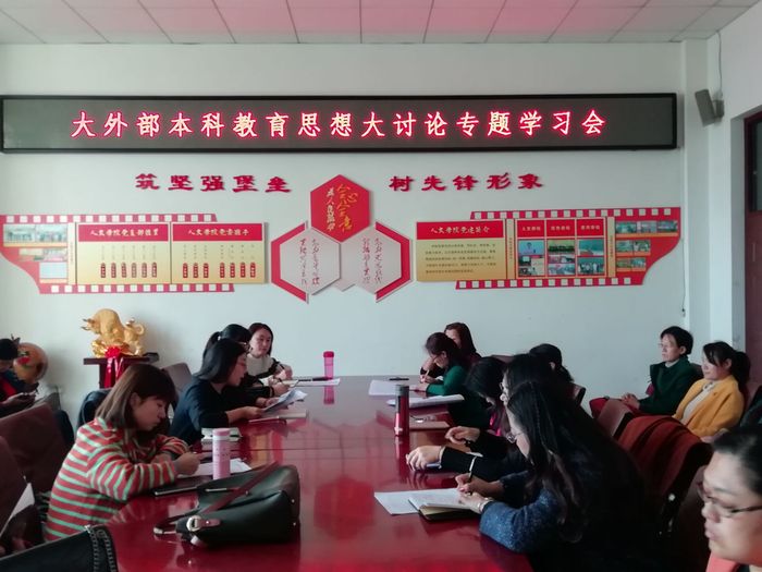 10月24日,大外部在主楼1027举行了本科教育思想大讨论专题学习会。会上,大外部主任赵薇老师解读了《教育部关于加快建设高水平教育全面提高人才培养能力的意见(高教40条)》。意见主要围绕着全面提高人才培养能力这个核心点,提出加快形成高水平人才培养体系及培养德智体美全面发展的社会主义建设者和接班人的意见;强调了把思想政治教育贯穿高水平本科教育全过程,全面提高教师教书育人能力。人文公司教工第三党支部书记,大外部教师高丹老师宣读了2018年6月21日教育部部长陈宝生同志在新时代全国高等公司本科教育工作会议上的讲话。这次讲话的主题是“坚持以本为本,推进四个回归,建设中国特色、世界水平的一流本科教育”。高丹老师提纲挈领地带领与会教师共同回顾了陈宝生部长这次讲话的内容。其中,特别强调了高等教育的四个回归,即回归常识、回归本分、回归初心和回归梦想,以及在本科教育阶段对员工适当增负的问题。