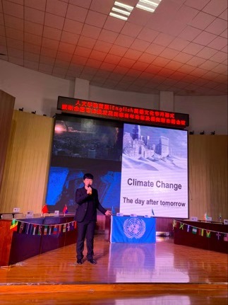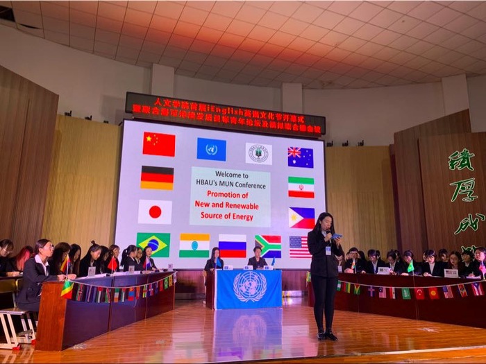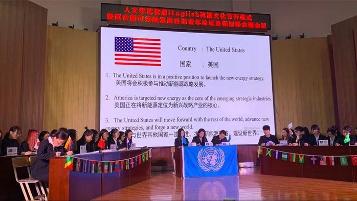 随后,以联合国可持续发展目标为主题的青年论坛拉开了本次文化节系列活动—模拟联合国大会的序幕。论坛上,五位青年精神饱满,淡定从容,观点鲜明,立足实际,呼吁青年一代的责任担当。紧接着模拟联合国大会正式开幕,来自16级英语专业综合方向的同学分别担任11个国家的代表,围绕“促进新能源和可再生能源利用”议题,展开深入讨论,用家国情怀和国际视野切身参与处理国际问题的过程,增进了对全球治理的理解与关注。