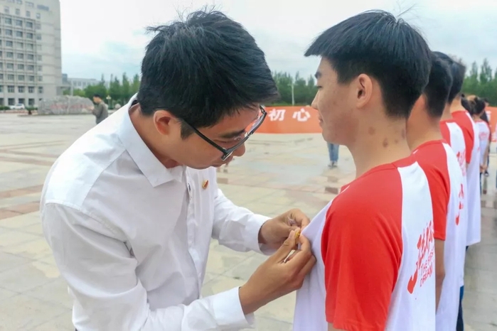 李传锋老师为新党员佩戴党徽