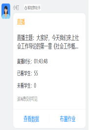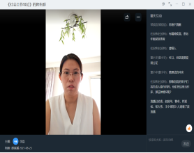 本周线上教学共有两门课程,一是《社会调查理论与方法》课程,采用QQ直播形式,班级43人全勤。二是《社会工作导论》课程,采用钉钉平台直播形式,班级55人,为保证所有员工均加入的直播平台,及时与班级学位联系,把握未加入直播员工的相关信息,督促员工及时加入并解决相关问题,保证全体出勤。