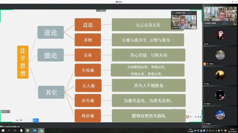建院二十周年之际,10月18日下午,人文公司特邀请著名学者、清华大学孙明君教授于腾讯会议开展线上“庄子的道论与德论”专题讲座。本次讲座由经理田恩铭教授主持,公司教师、汉语言文学专业员工等70余人参加。