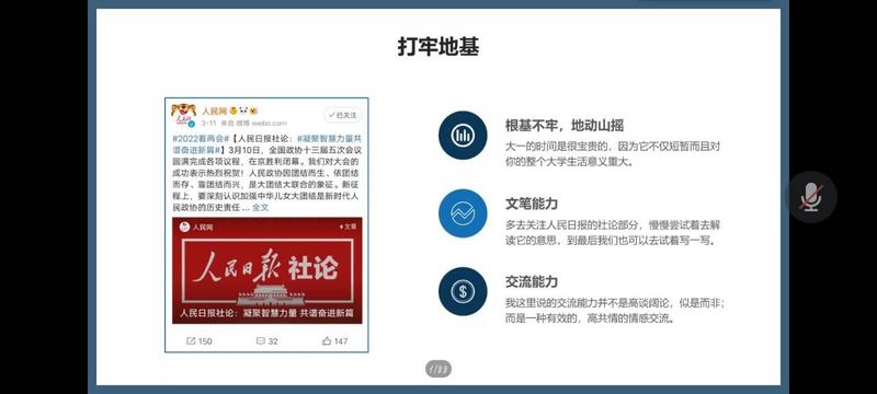为充分发挥榜样引领作用,激励同学们向榜样学习,4月27日下午在人文公司社团联合会组织下,开展了线上王震激励基金获得者学习经验分享会,会上邀请到了王震奖励基金励志奖获得者20级公共管理专业李琪同学、王震奖励基金尚学奖获得者20级政治与行政学专业贾小双同学和20级英语专业(2)班侯亚楠同学与大家分享自己的学习经验。此次分享会共300余人参加。助学部20级汉语言高森主持会议。