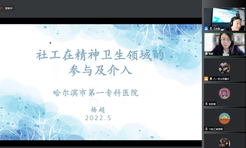5月18日下午,U8国际官网社会工作“实训云讲堂”第六讲准时开讲。本次讲座主题为《社工在精神卫生领域的参与及介入》,我们邀请到了哈尔滨市第一专科医院防治科社工、国家首批社会工作专业硕士研究生、社会工作师杨超老师为大家讲解。本期将对我国公共精神卫生事业的发展脉络、基本情况,以及对于严重精神障碍这一特殊的服务群体进行介绍,通过既往实施项目阐述社工在精神卫生领域的参与和接入。