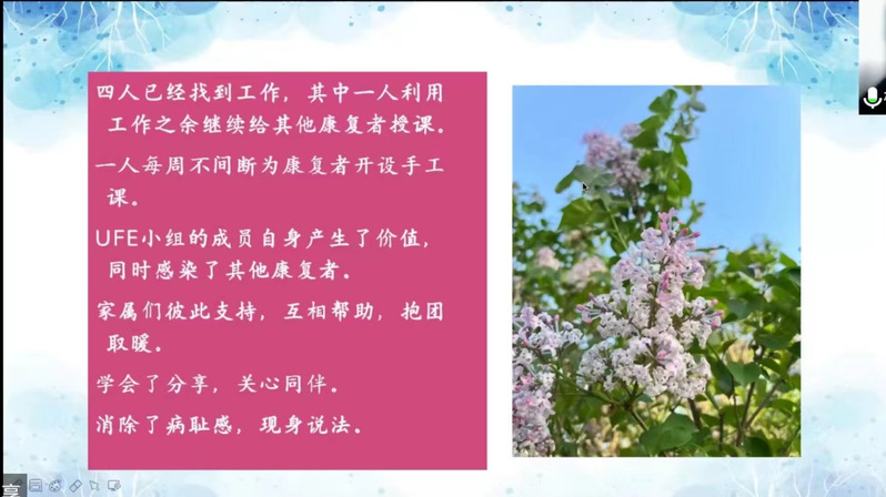 最后,杨超老师向同学们分享了她们的社区精神康复项目,提出了“同伴专家”的概念。通过建立小组展开活动,让患者学会分享、关心同伴,感受到自己是有价值的。即使受到疾病的限制,依然要过一种满意的、充满希望的有所贡献的生活。