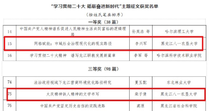 为全面贯彻党的二十大精神,团结引领黑龙江省社会科学界把握历史主动、汲取奋进智慧,进一步用习近平新时代中国特色社会主义思想武装头脑、指导实践,踔厉奋发、勇毅前行。省社科联以“学习贯彻二十大砥砺奋进新时代”为主题组织开展了论文征集和评审工作。公司教师李兴军的论文《网格赋能:市域社会治理现代化的现实路径》喜获一等奖、柴子倩的论文《大庆精神铁人精神的文学书写》荣获三等奖。