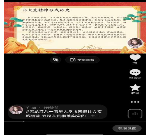 将视频发布到新媒体平台,用视频将大家所学到的知识记录下来,传承传播我们国家的优秀精神,通过北大荒精神与红色精神传播先辈们的英勇事迹,激励全国人民不断奋进,勇毅前行!