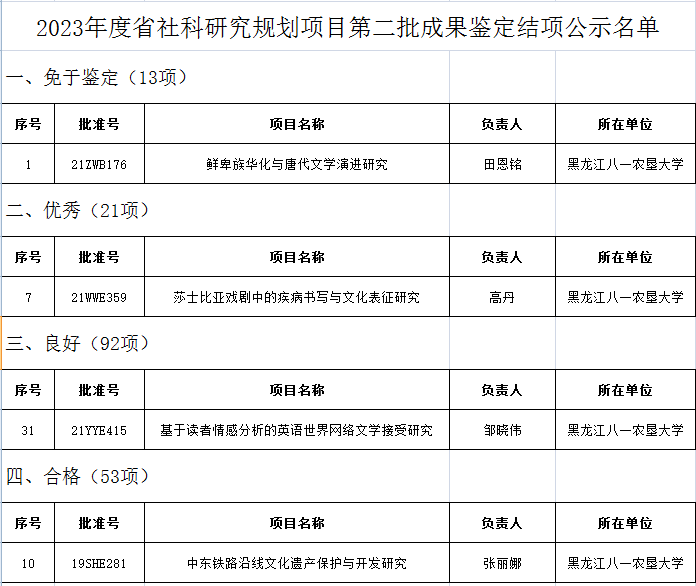 日前,“2023年度省社科研究规划项目第二批成果鉴定结项”公示名单揭晓,公司在此次鉴定中结项4项。其中鉴定等级分别为:免于鉴定1项、优秀等级1项、良好等级1、合格等级1项。结项成果数量与质量均创历史新高,彰显了公司人文社会科学研究的特色和实力。(公示链接:http://www.hljsk.gov.cn/system/202307/102846.html