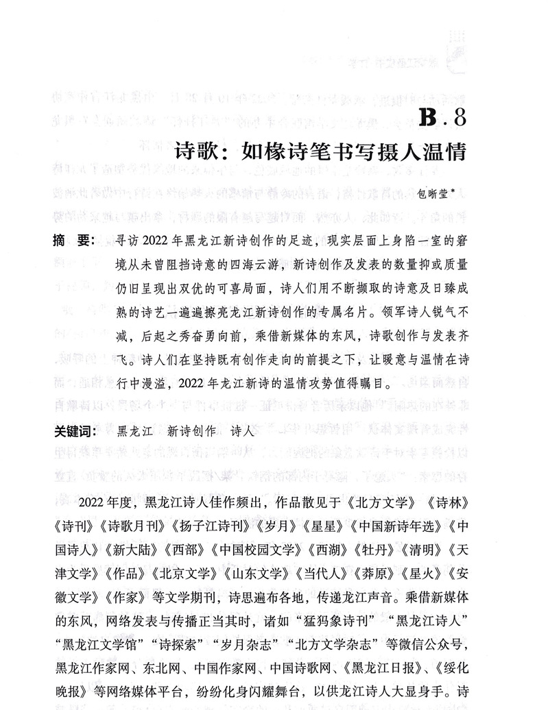 作为土生土长的黑龙江人,一直潜心汉语新诗研究的包晰莹老师动用丰富的在地经验观照黑龙江新诗,在“创作地域文学精品 唱响文学惠民旋律”大前提下,于论文书写中寻访2022年黑龙江新诗创作的足迹。文章列举黑龙江诗人的相关诗作,用极富个性的书写带领读者领略2022年龙江新诗创作的温情攻势:“2022年,龙江诗人用诗歌之技呼应着诗歌之道,以此两全之法在诗行中架火,让靠近诗歌的人同样能体会到一种温情的烧灼。他们用哲思之语营构温情,用亲缘之念传递温情,用地域之恋倾诉温情,用如椽诗笔谱就2022年龙江诗歌爱与美的温情长卷。”
