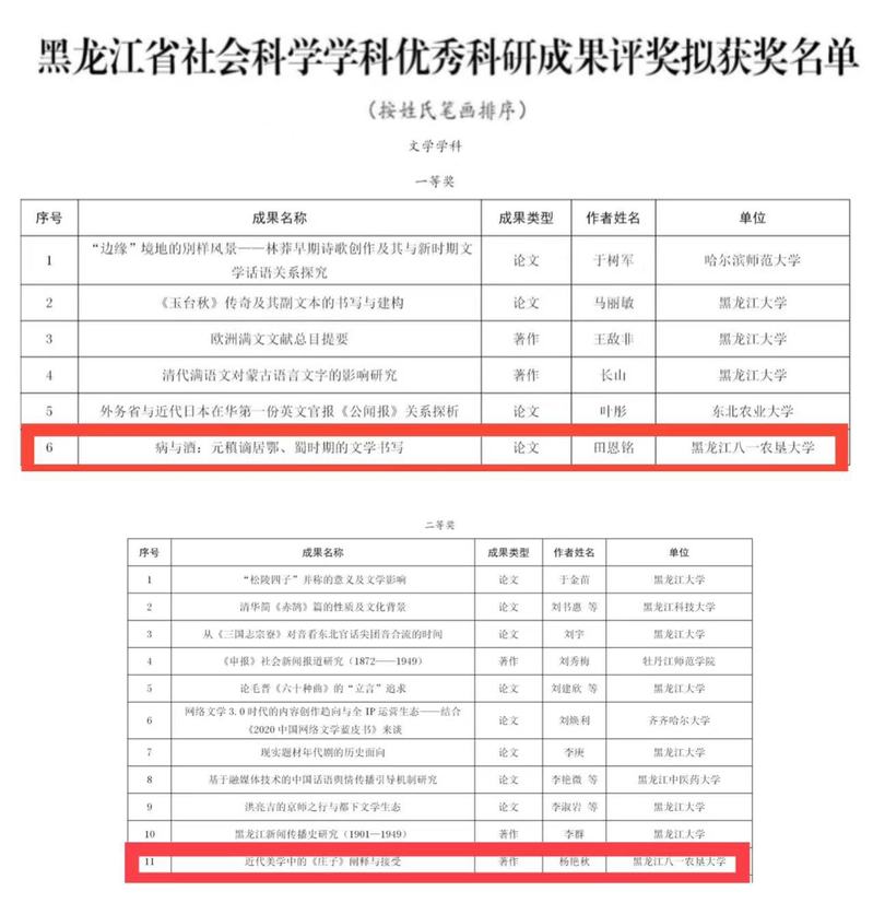 近日,2023年度黑龙江省社会科学学科优秀科研成果奖评奖结果正式公布。公司共2项成果获奖,其中田恩铭教授的论文《病与酒:元稹谪居鄂、蜀时期的文学书写》喜获一等奖、杨艳秋教授的著作《近代美学中的<庄子>阐释与接受》荣获二等奖,获奖数量与成果质量均创佳绩,彰显了公司人文社会科学研究的特色和实力。