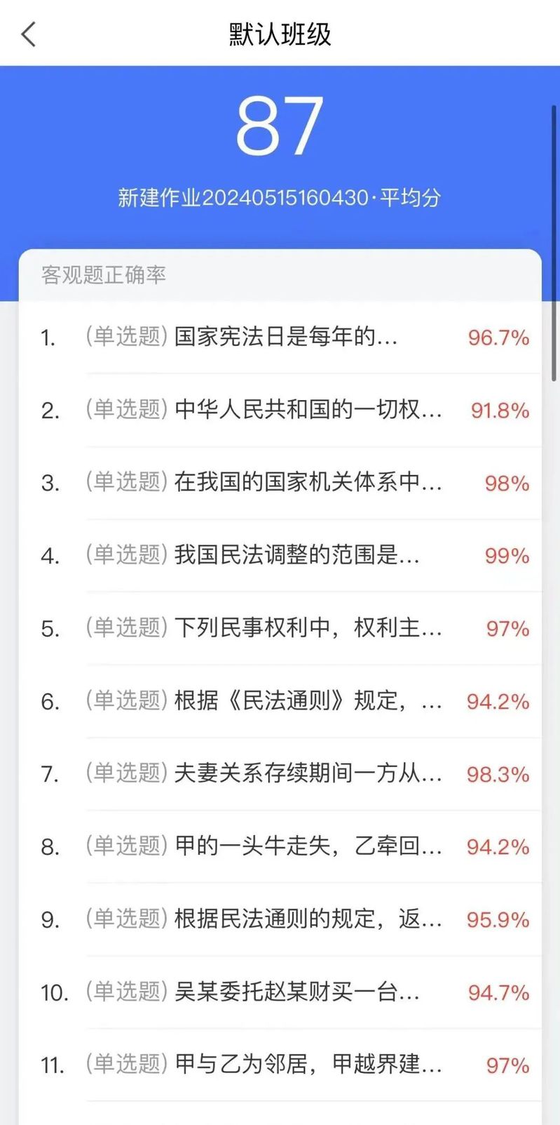 为普及民法知识,提高老员工群体的法律素养和自我保护能力,U8国际官网普法协会举办了“探索法治之路,共建法治校园”《民法典》知识竞赛活动。1500人通过学习通平台参与了此次竞赛。