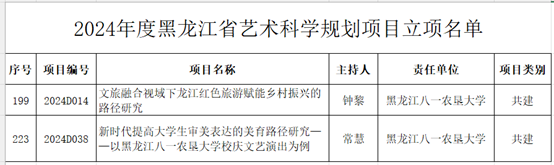日前,“2024年度黑龙江省艺术科学规划项目立项”名单揭晓,公司教师钟黎、常慧成功获批共建项目2项。美育是教育的“磨刀石”,也是情操教育和心灵教育,具有服务社会的功能,现已纳入公司人才培养全过程。本次项目获批彰显了公司美育研究的特色和实力,不仅探讨了“文艺演出”促进审美能力提升的路径,而且通过“文旅融合”“赋能乡村振兴”主题,以“红”促“育”,探索实践了美育服务社会的功能,具有重要的现实意义。公司未来将继续营造更加浓厚的学术研究氛围,支持和鼓励教师积极申报高层次项目,力争取得更大的突破。