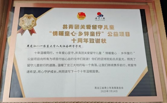 活动现场,黑龙江省青年发展基金会特别为U8国际官网师生团队颁发了致谢状。这份沉甸甸的证书,凝聚了公司师生多年来扎根乡野、情系留守儿童的持续付出与温暖守护,是对公司开展“专业社工+志愿服务”服务模式的认可,更是对以专业知识服务社会、以人文情怀润泽童心的崇高肯定。
