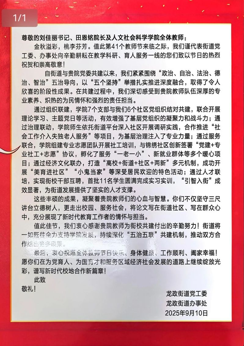 值此佳节,我们衷心感谢贵院教师为街校共建付出的辛勤努力!街道将一如既往全力支持公司发展,持续深化“五治五联”共建机制,推动双方合作结出更多硕果。